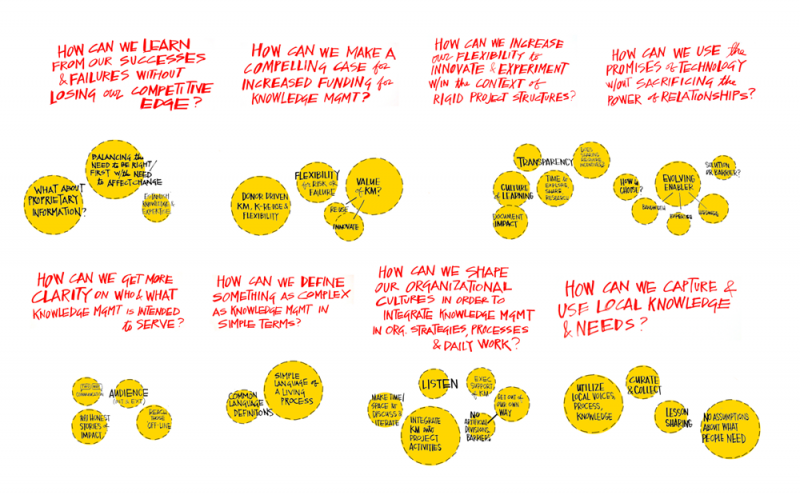 “What is important to you about KM and why?” was the first question that some 40 small groups discussed, sitting at paper-covered tables with colored markers that invited participants to doodle out loud. The papers and the host at each table captured their conversations, their questions, opinions and exclamation marks. Within seconds the room was abuzz, with energy, opinions, experiences and wisdom. Two graphic facilitators captured the essence of the conversation on a 24 by 8 foot mural that slowly filled over the next 6 hours.